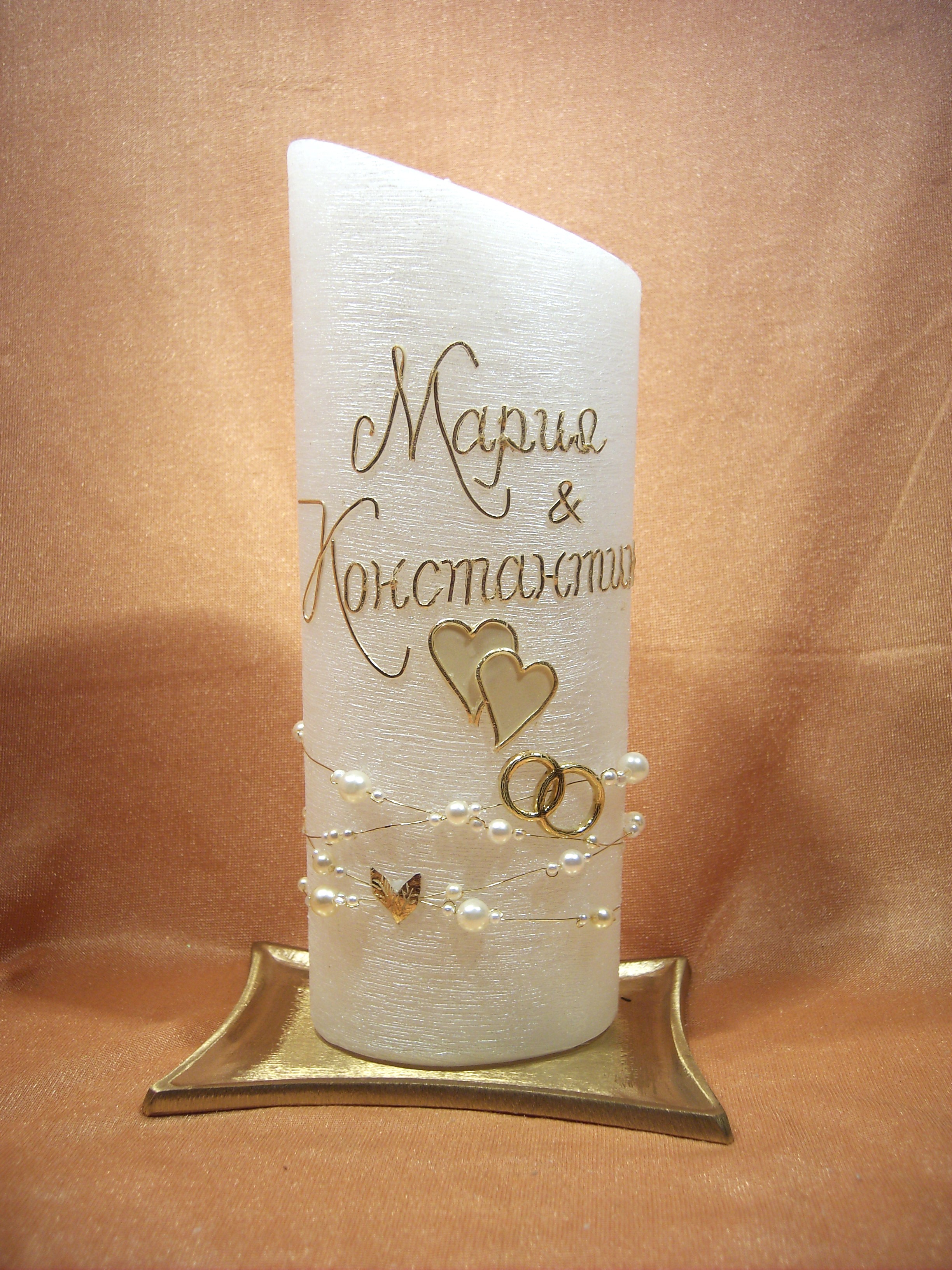 Für die besonderen Momente im Leben... eine sehr schöne Hochzeitskerze in Perlmutt-Struktur mit einer handgefertigten Perlenkette werden die goldene Wachsringe am unteren Teil der Kerze verbunden im Zeichen der Liebe zwei Perlmutt - Creme Herzen mit Wachsstreifen in Gold verziert elegant wirkt die Hochzeitskerze erst mit Ihren persönlichen Namen