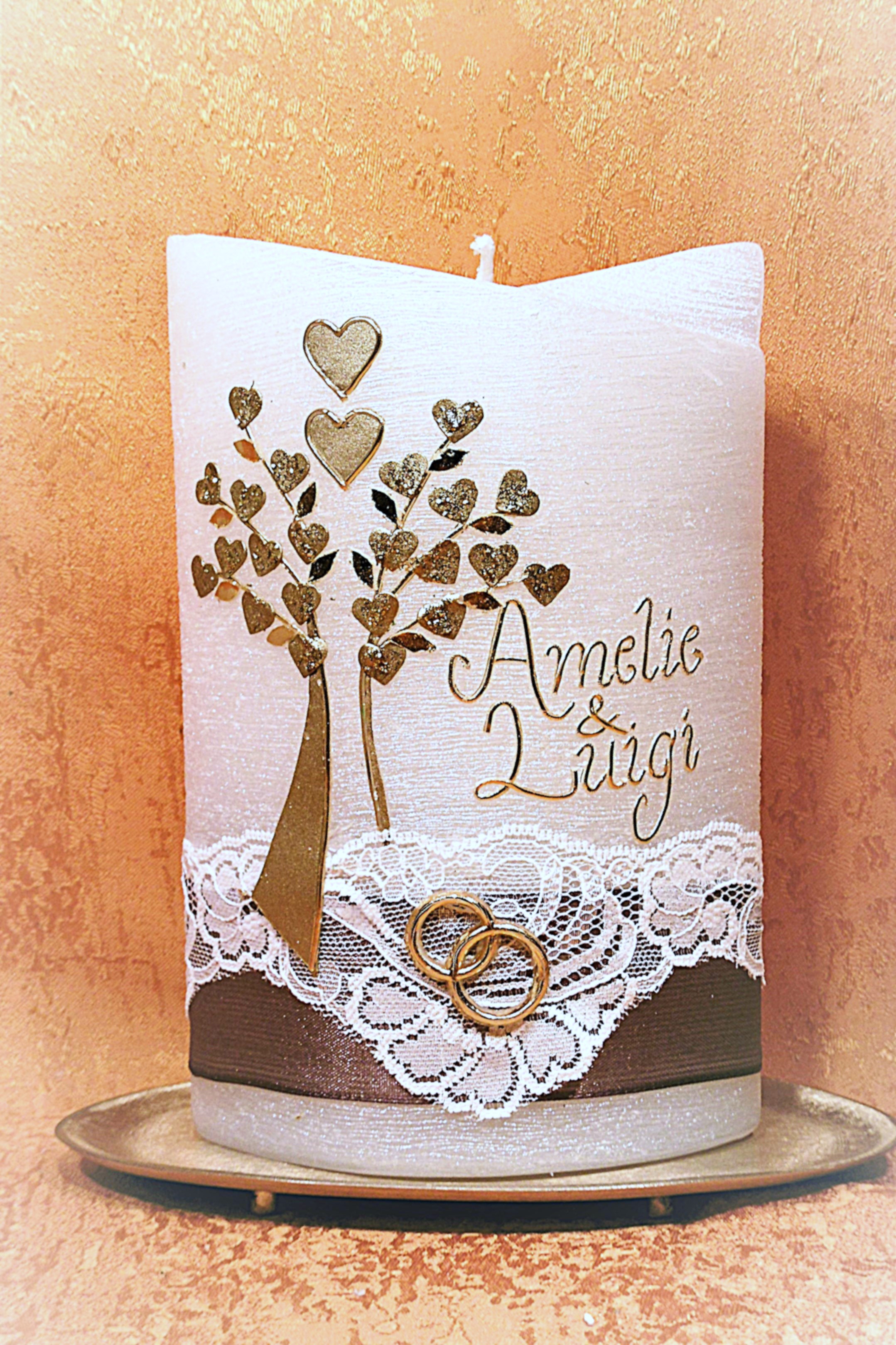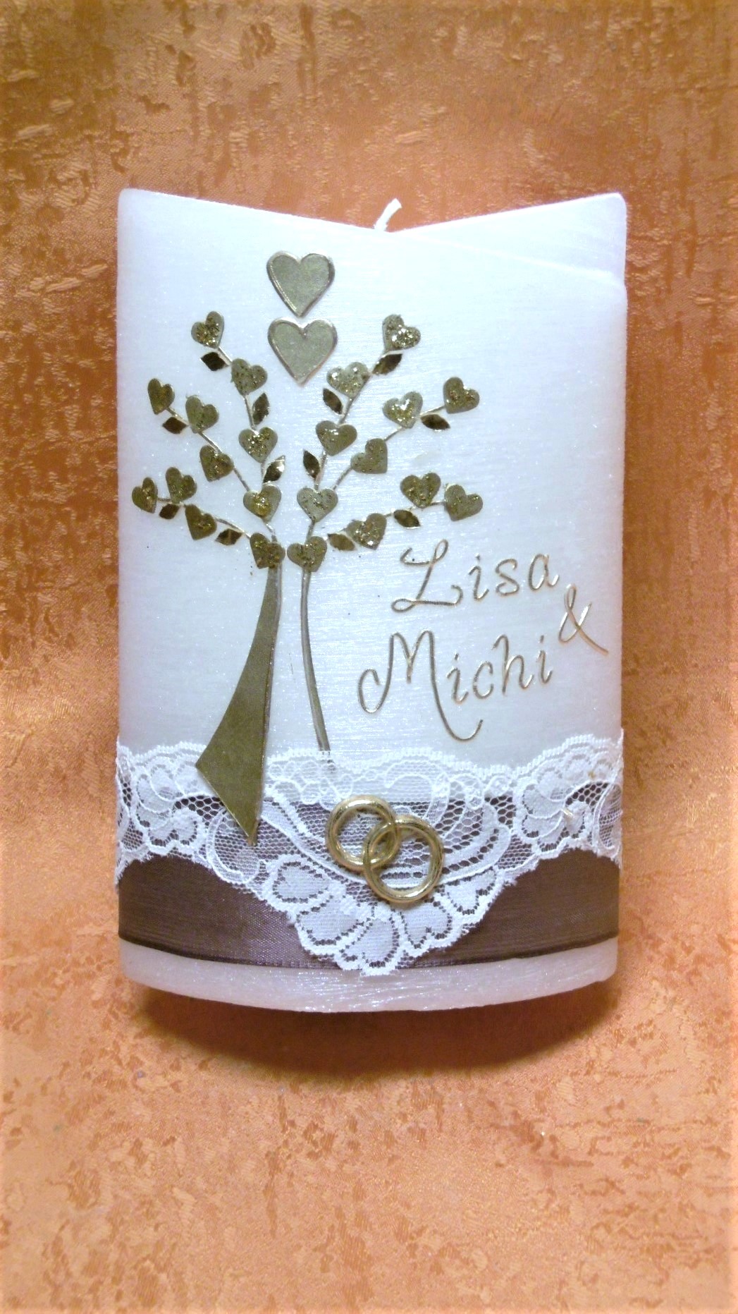 Hochzeitskerze Perlmutt Vintage Lebensbaum Herzen matt Gold Spitzenborte 0015