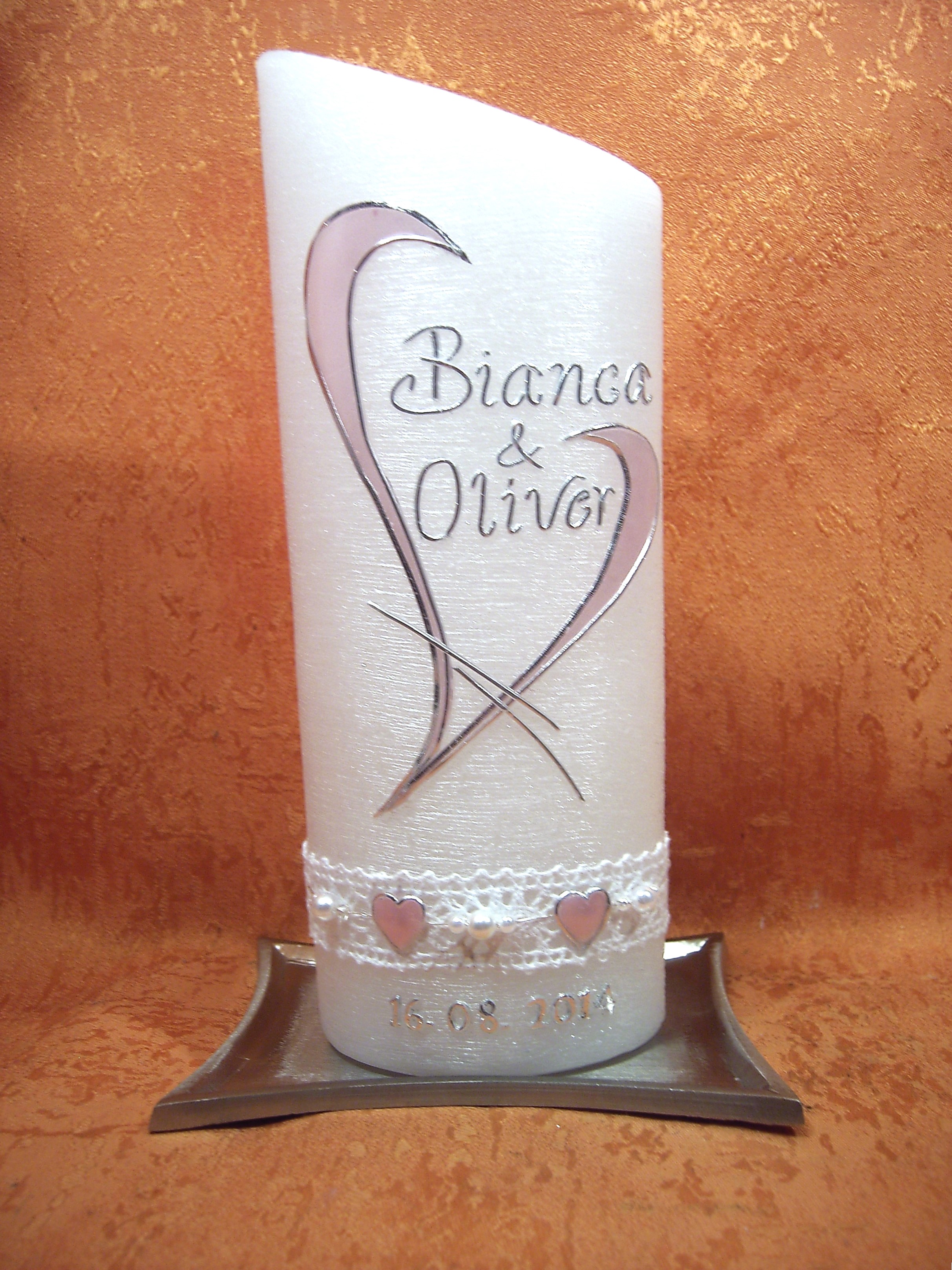 Hochzeitskerze Perlmutt im Vintage Look offenes Herz in der Farbe zartrosa mit Silber Wachsstreifen eingefasst unten eine weiße Bordüre mit Perlenkette zwei Herzen auf der Rückseite Silber Wachsringe oben ein schlichtes Kreuz.