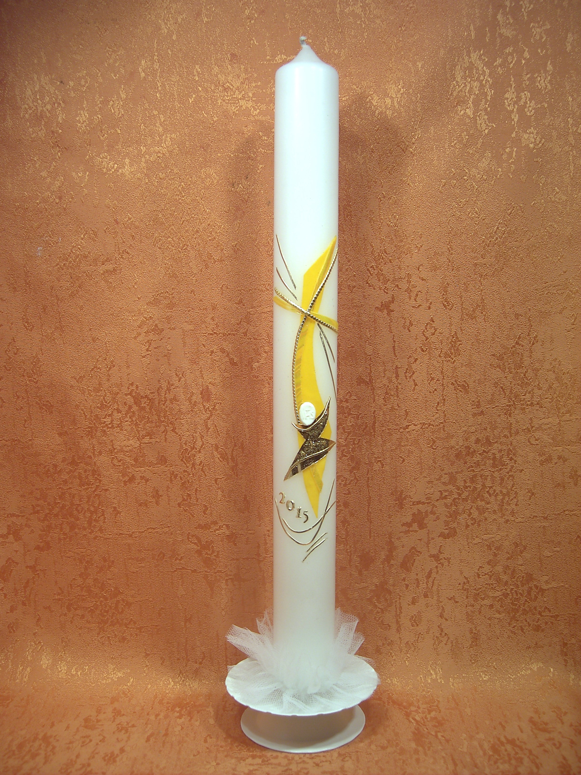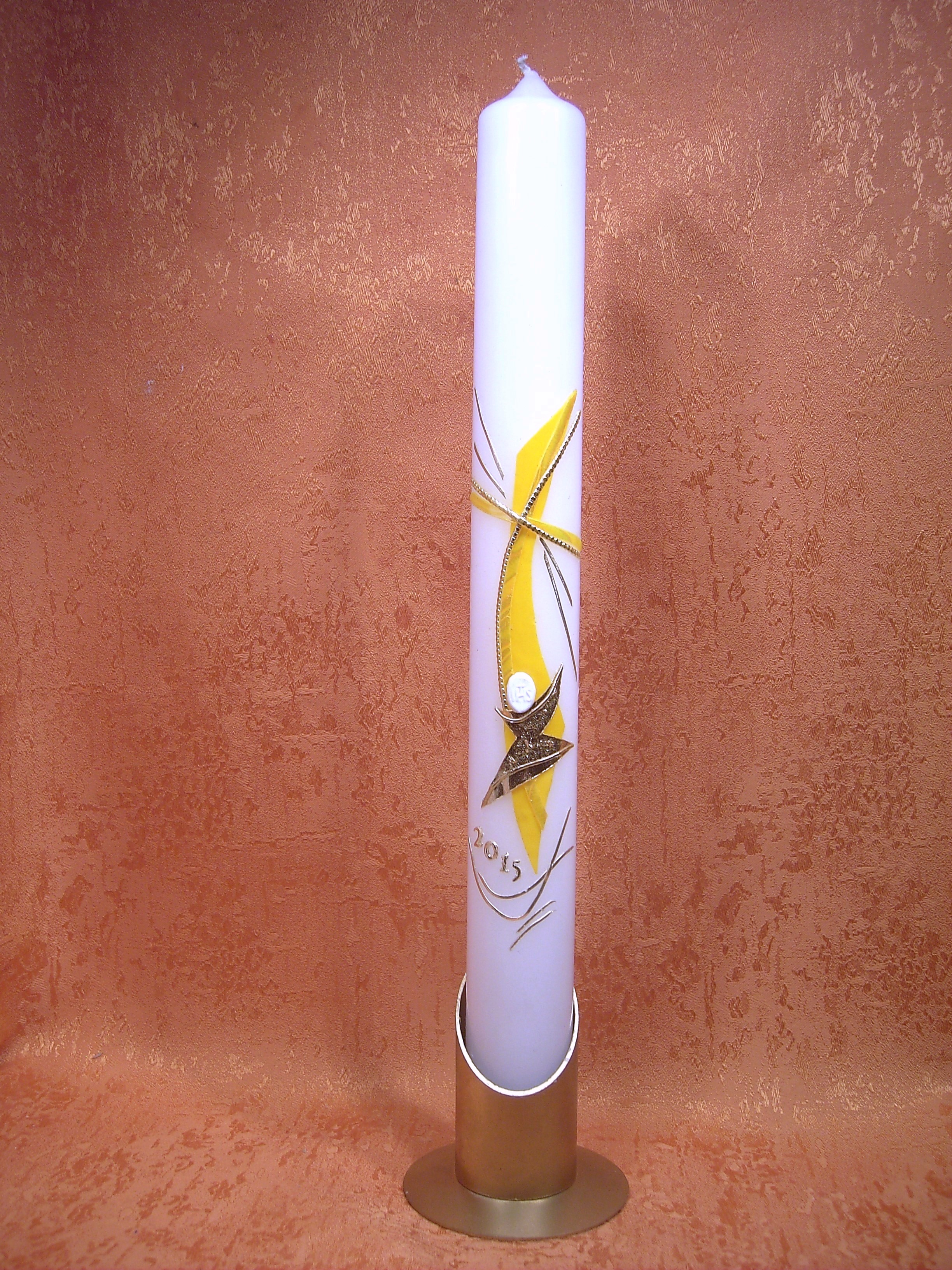 Kommunionkerze ein schlichtes Kreuz für Jungen oder Mädchen in der Farbe sonnengelb zwei gold Wachsstreifen liegen auf den Motiv unten in Glanzgold mit Glimmer abgestzt ein moderner Kelch mit einer weißen Hostie