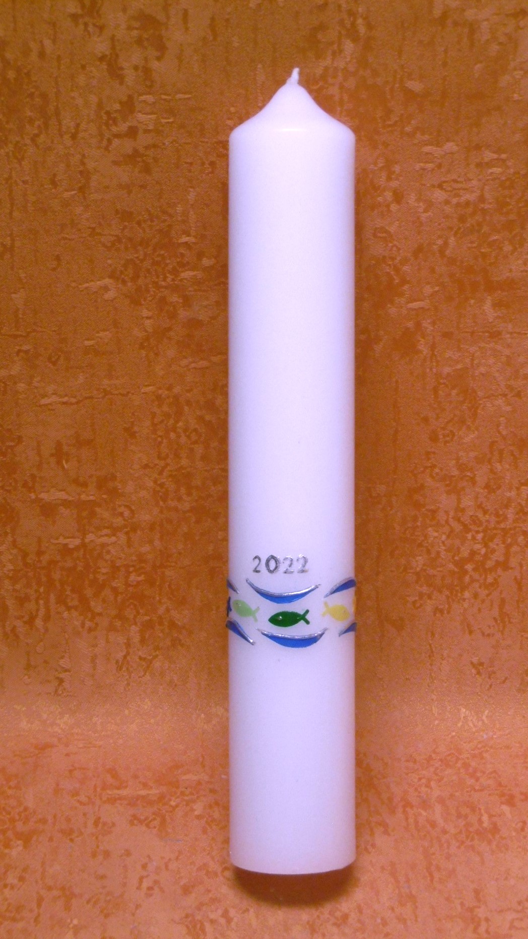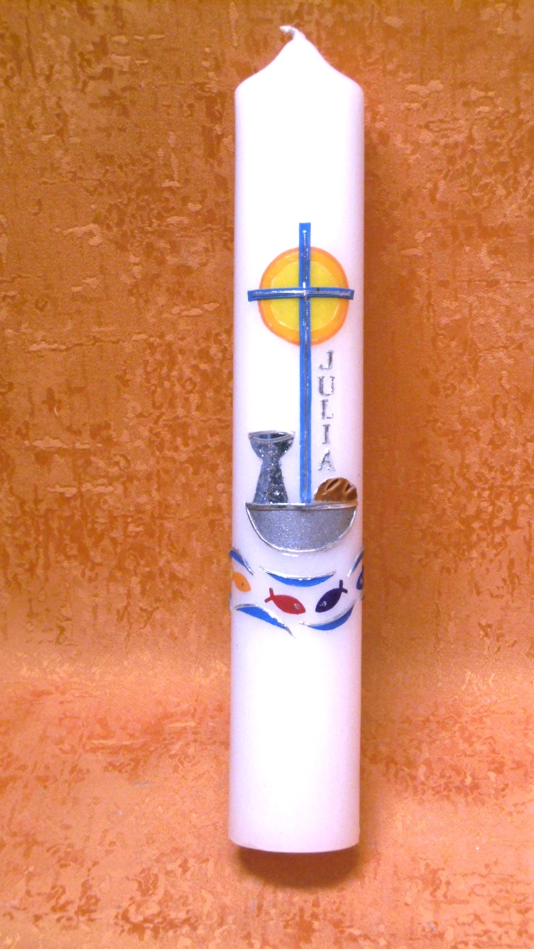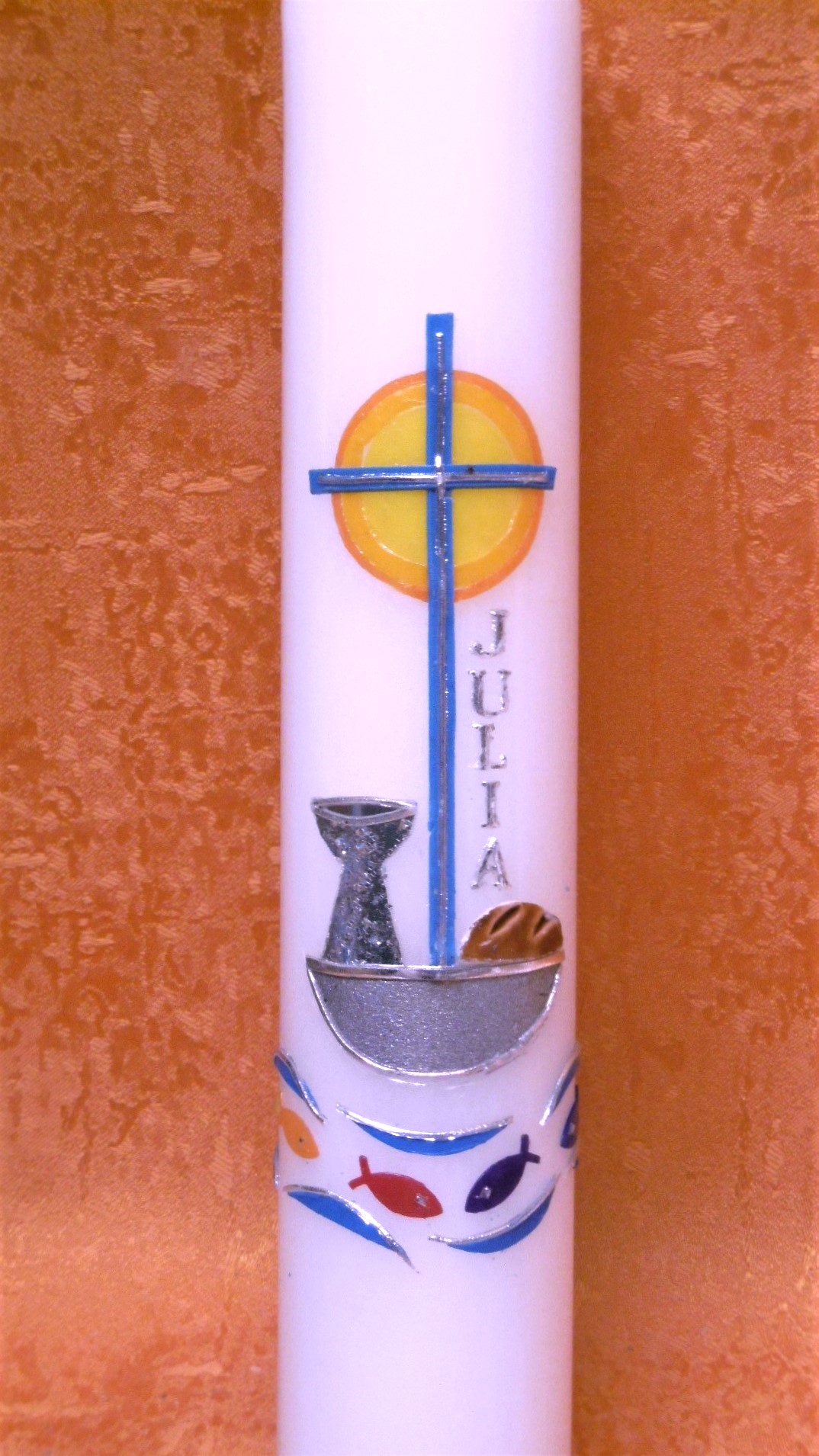 Kommunionkerze für Junge und Mädchen die Gestaltung oben eine Sonne das Kreuz türkis Silber am Tisch einen moderner Kelch Brot, unten eine Wellenborte mit Fischen in Regenbogenfarben.