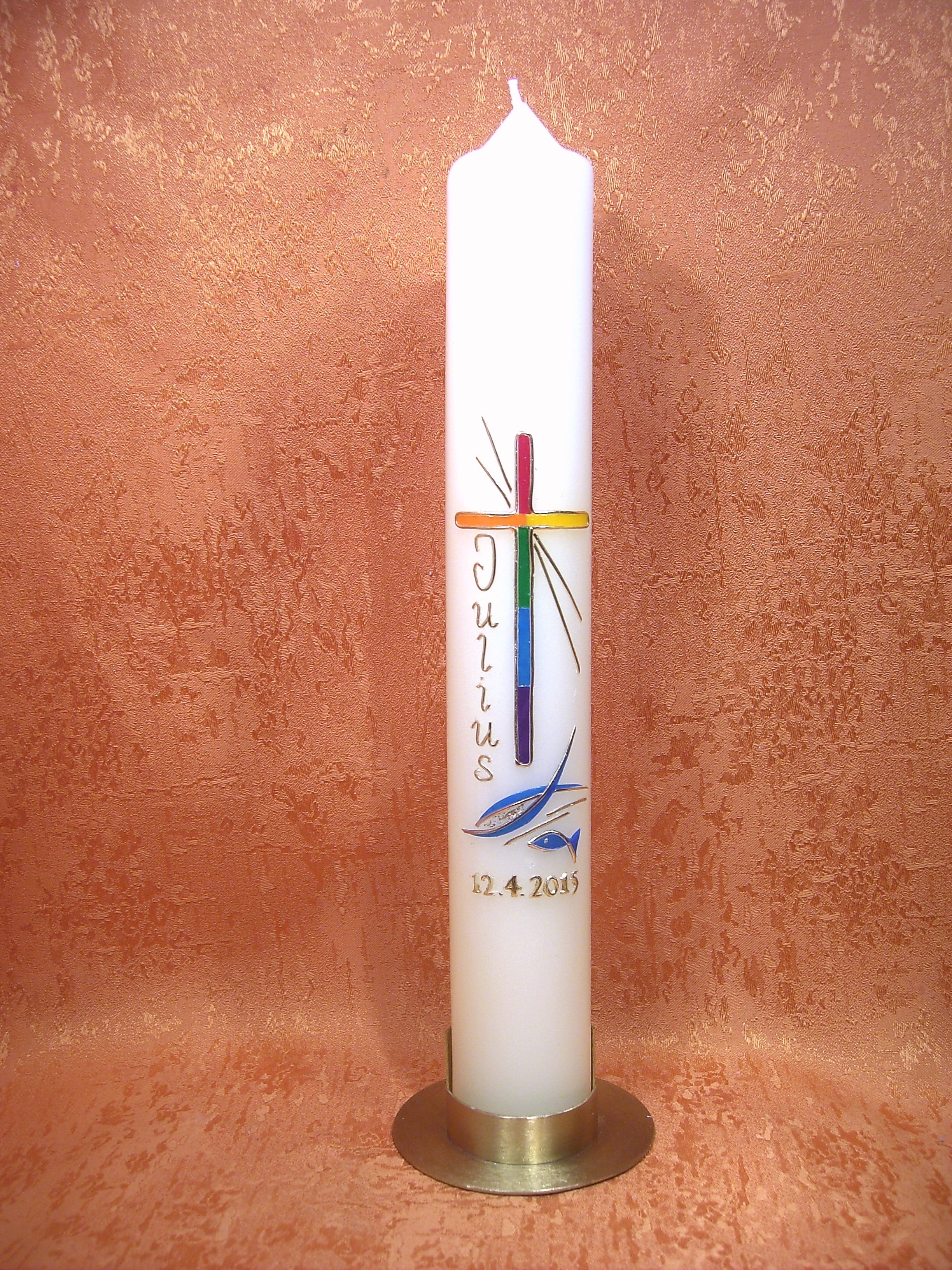 eine schlichte Taufkerze oder Kommunionkerze zu den Thema Regenbogen das Kreuz in Regenbogenfarben mit goldene Wachstreifen eingefasst unter dem Kreuz zwei Fische