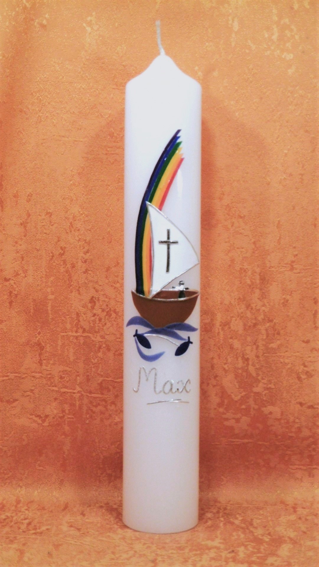 Taufkerze oder Kommunionkerze für Mädchen und Jungen ein hellbraunes Boot mit weißen Segeln in der Mitte das Kreuz Jesus, Wellen und Fische begleiten das Boot, an der Seite ein langer Regenbogen.