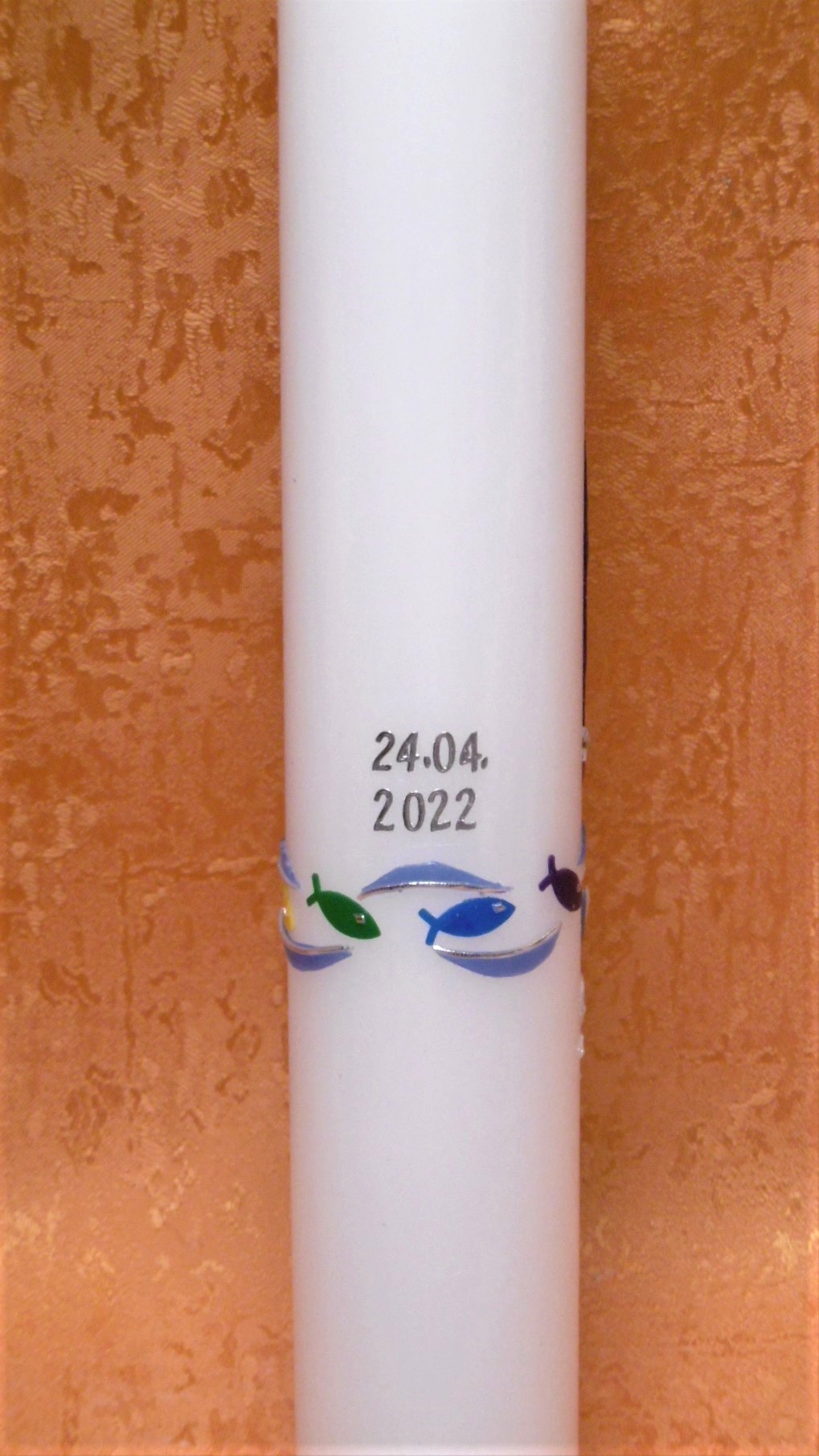 Taufkerze oder Kommunionkerze für Mädchen und Jungen ein hellbraunes Boot mit weißen Segeln in der Mitte das Kreuz Jesus, Wellen und Fische in Regenbogenfarben begleiten das Boot, an der Seite ein langer Regenbogen.
