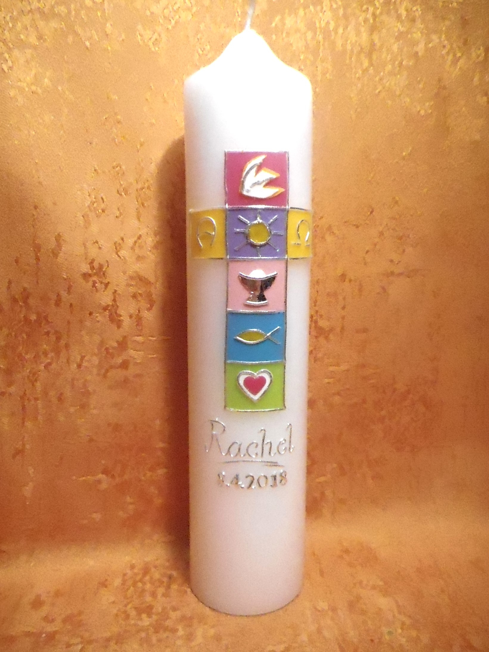 eine sehr schöne Taufkerze oder eine Kommunionkerze für Mädchen Jungen, verschiedene Elemente in ihrer Persönliche Farbkombination gestaltet, die Farben der Anordnung Fuchsia, sonnengelb, Flieder, rosa, türkis und gelbgrün mit einem Silber Wachsstreifen verziert, im Feld oben eine Taube, Alpha und Omega, Sonne, Kelch, Fisch, Herz ,,für eine Taufkerze andere Symbole''