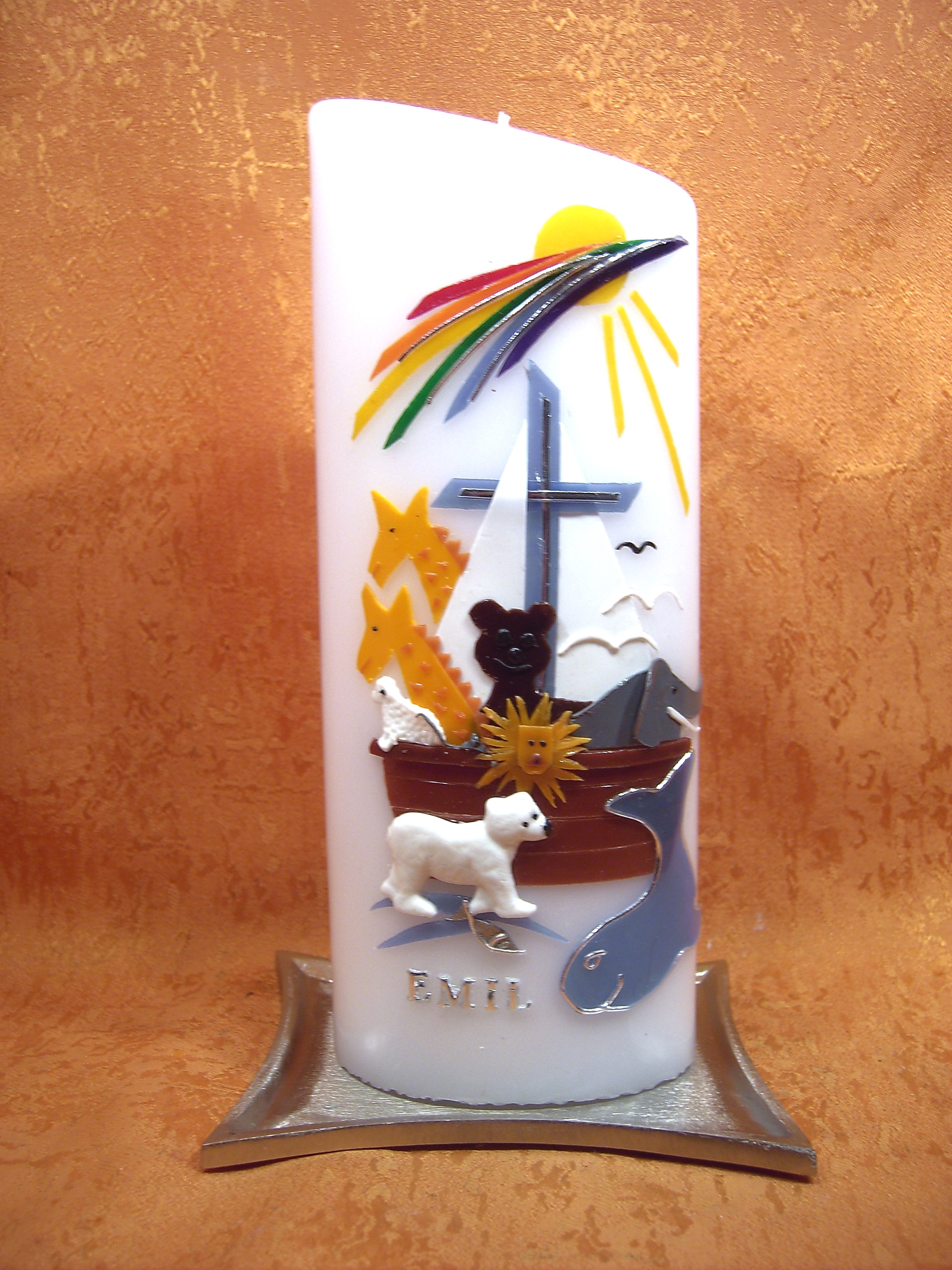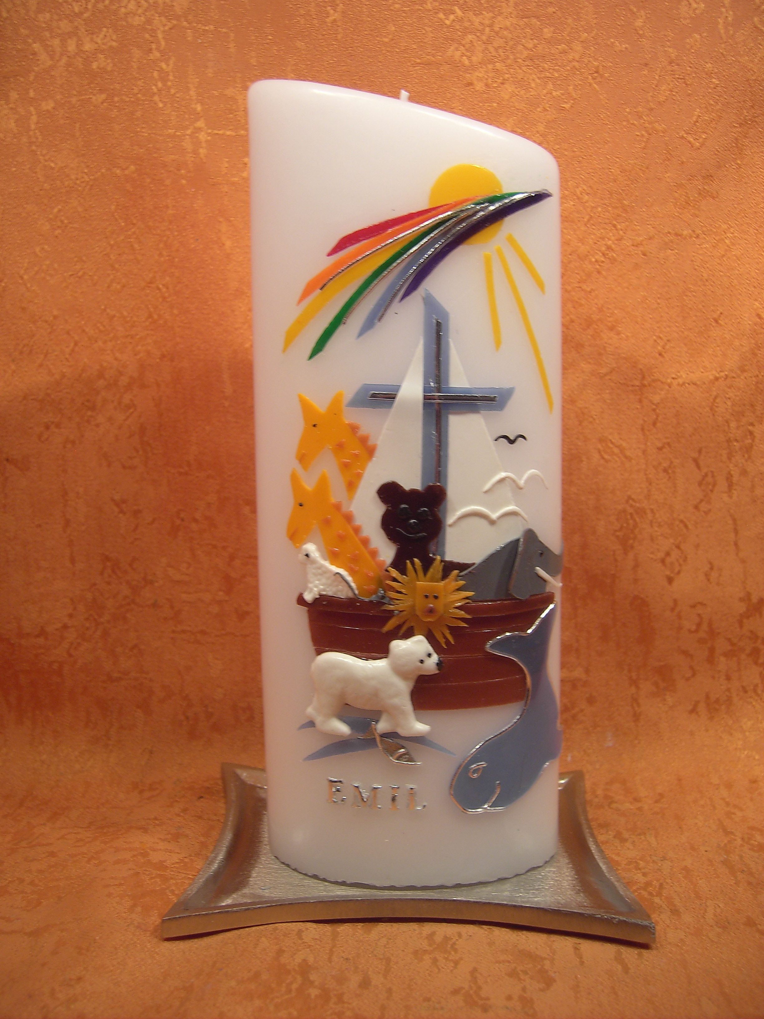für diesen besonderen Tag wird dein Taufpate oder Taufpatin diese Taufkerze in den Händen halten mit deinen Namen und dem Motiv von der Arche Noah, eine moderne Gestaltung ,,für Jungen oder Mädchen'' oben ein Regenbogen mit Sonne in der Mitte das Kreuz Christi mit weißen Segeln auf der Arche viele Tiere alles aus Wachs gestaltet Ihren Persönlichen Taufspruch auf der Rückseite mit