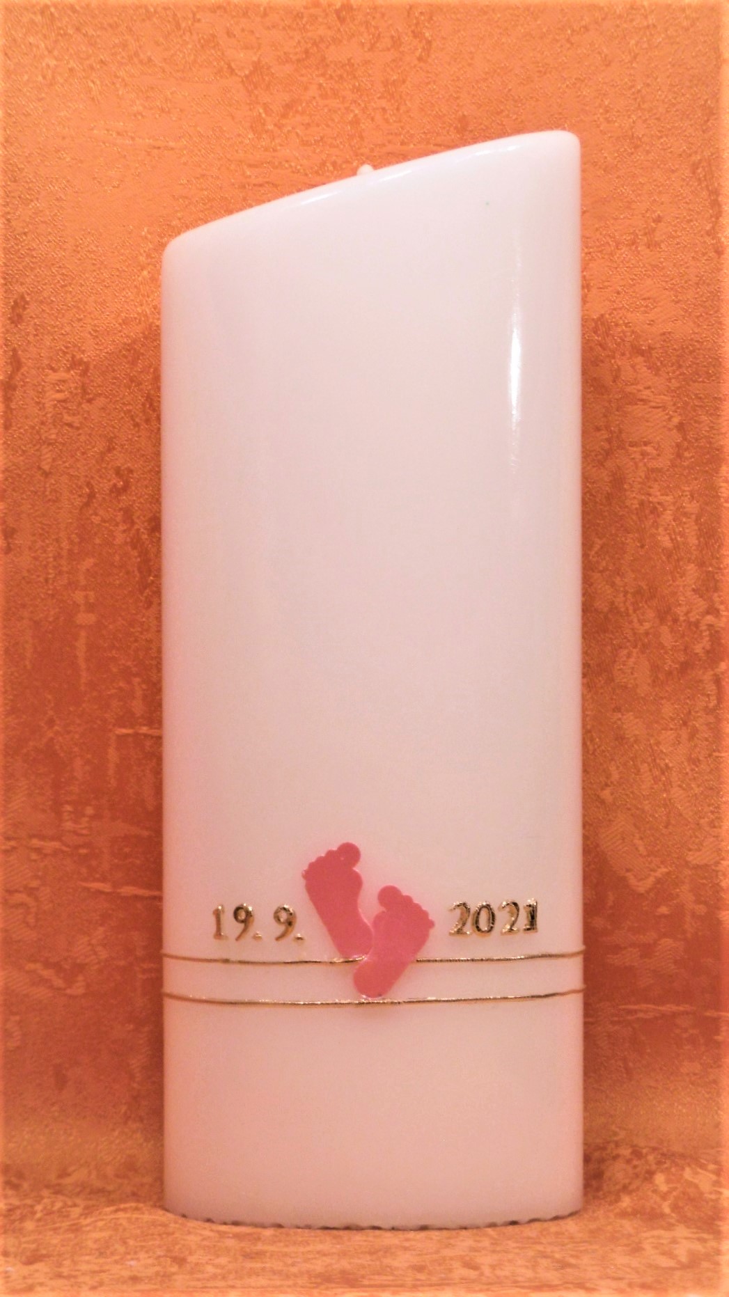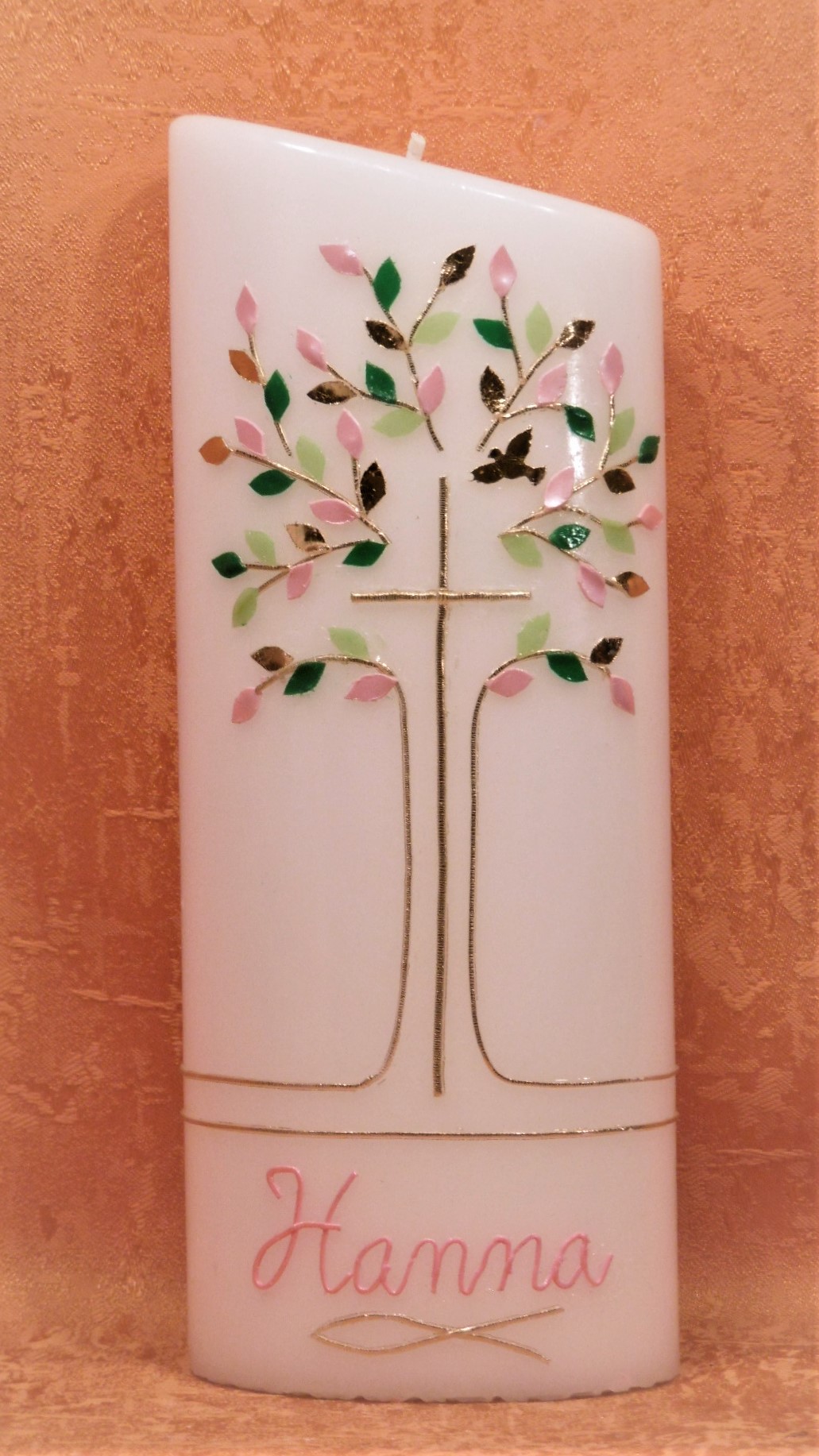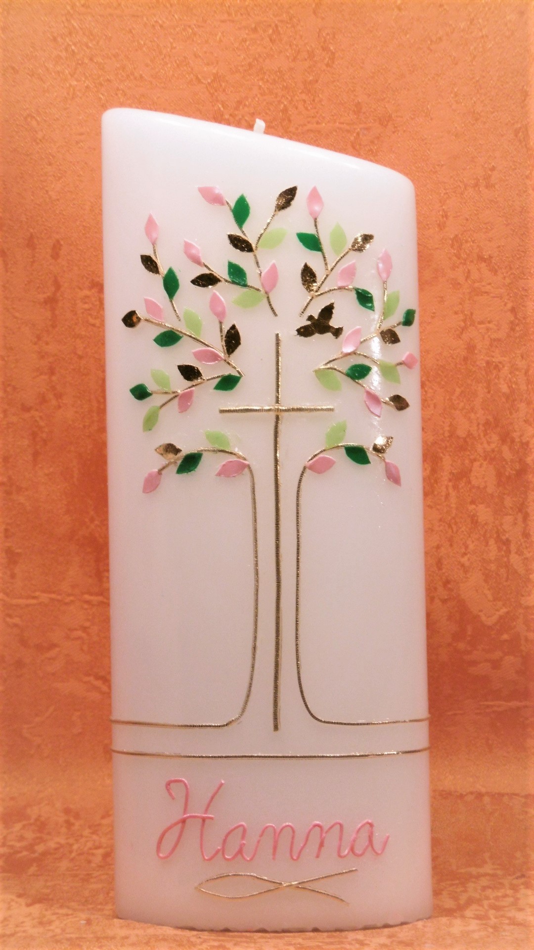 Lebensbaum rosa grün Gold gehaltenein moderner Style die Blätter vom Baum in drei Farben gestaltet in der Mitte vom Baum ein goldenes Kreuz eine schmale Wachsborte umschließt die Taufkerze, die Schrift individuell.
