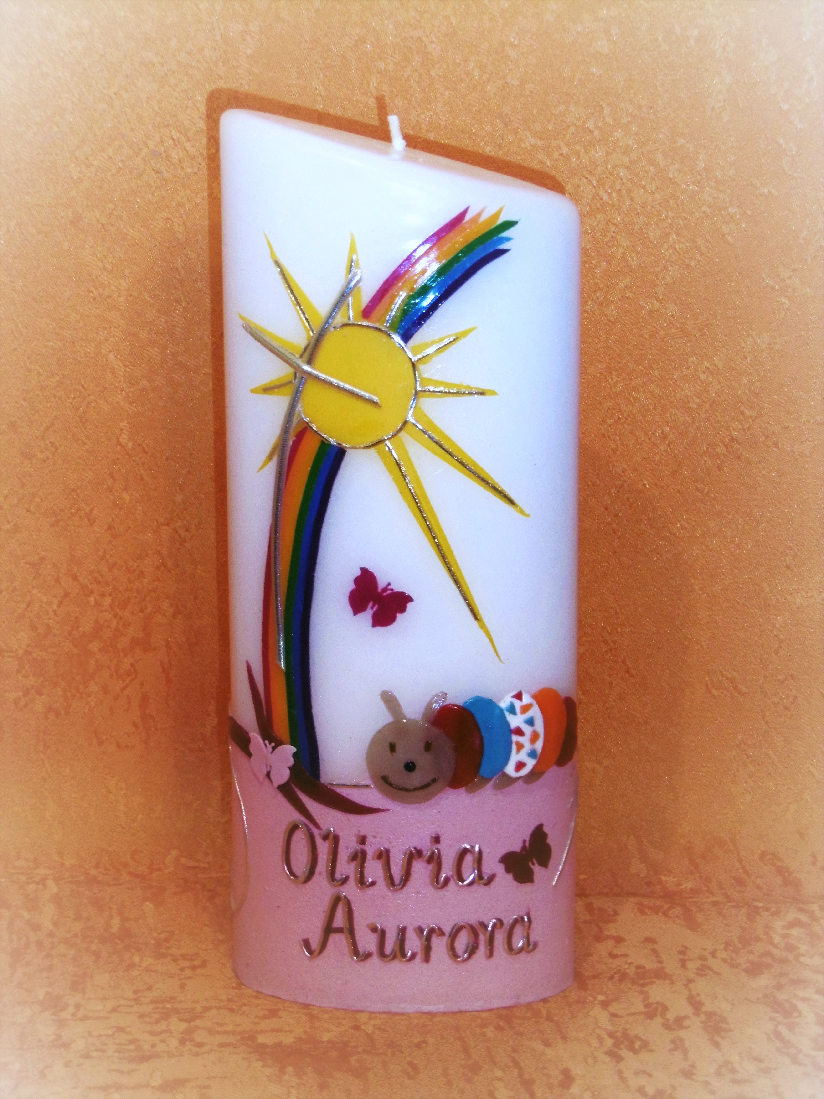 genau die richtige Taufkerze für Mädchen edle rosa Wachs Bemalung an der Seite eine kleine bunte Raupe, unten der Taufname wird hervorgehoben in brombeerfarben mit Silber Wachsstreifen verziert oben eine strahlende Sonne durch den Regenbogen auf der Rückseite zwei Füßchen angeordnet.
