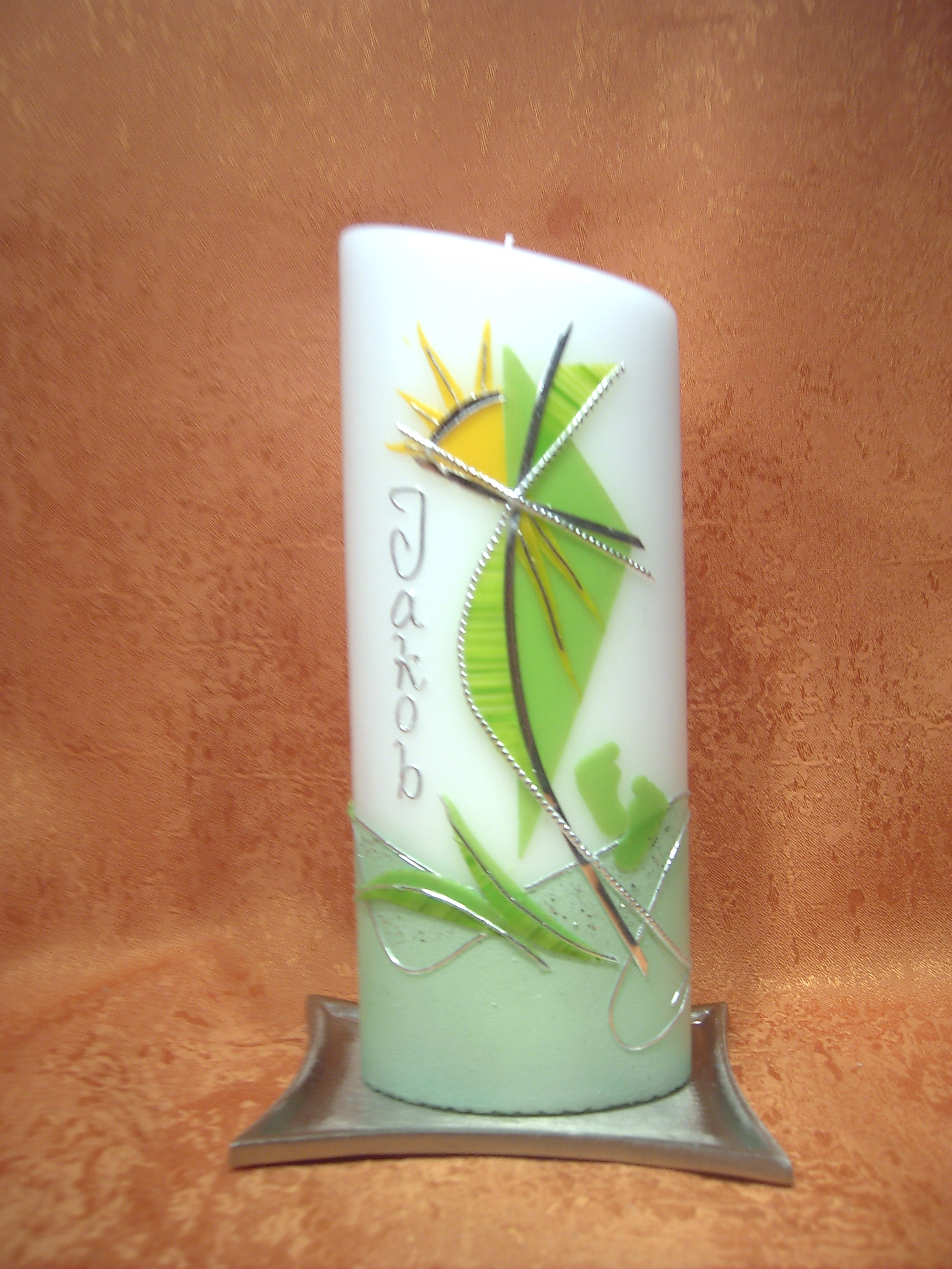 Taufkerze mit einer grüne Wachs Bemalung passend zu dem modernen Kreuz in den Farben gelbgrün und grün-gestreift abgesetzt mit zwei Silber Wachsstreifen hervorgehoben auf der linken Seite vom Kreuz strahlt die Sonne unten zwei Füßchen und Wellen auf der Rückseite Fußspuren.