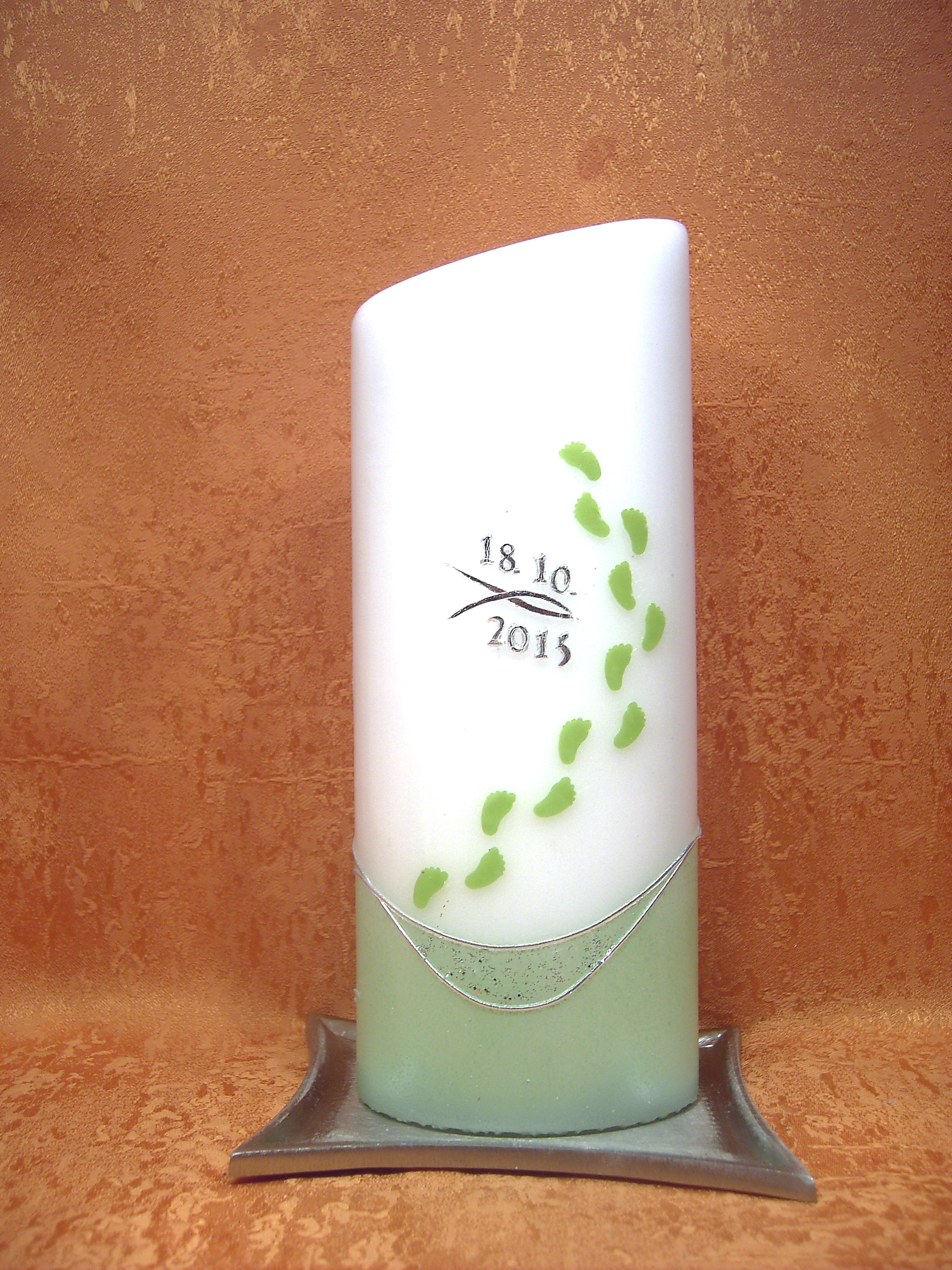Taufkerze grün modern edles Design mit Sonne und Fußspuren 268